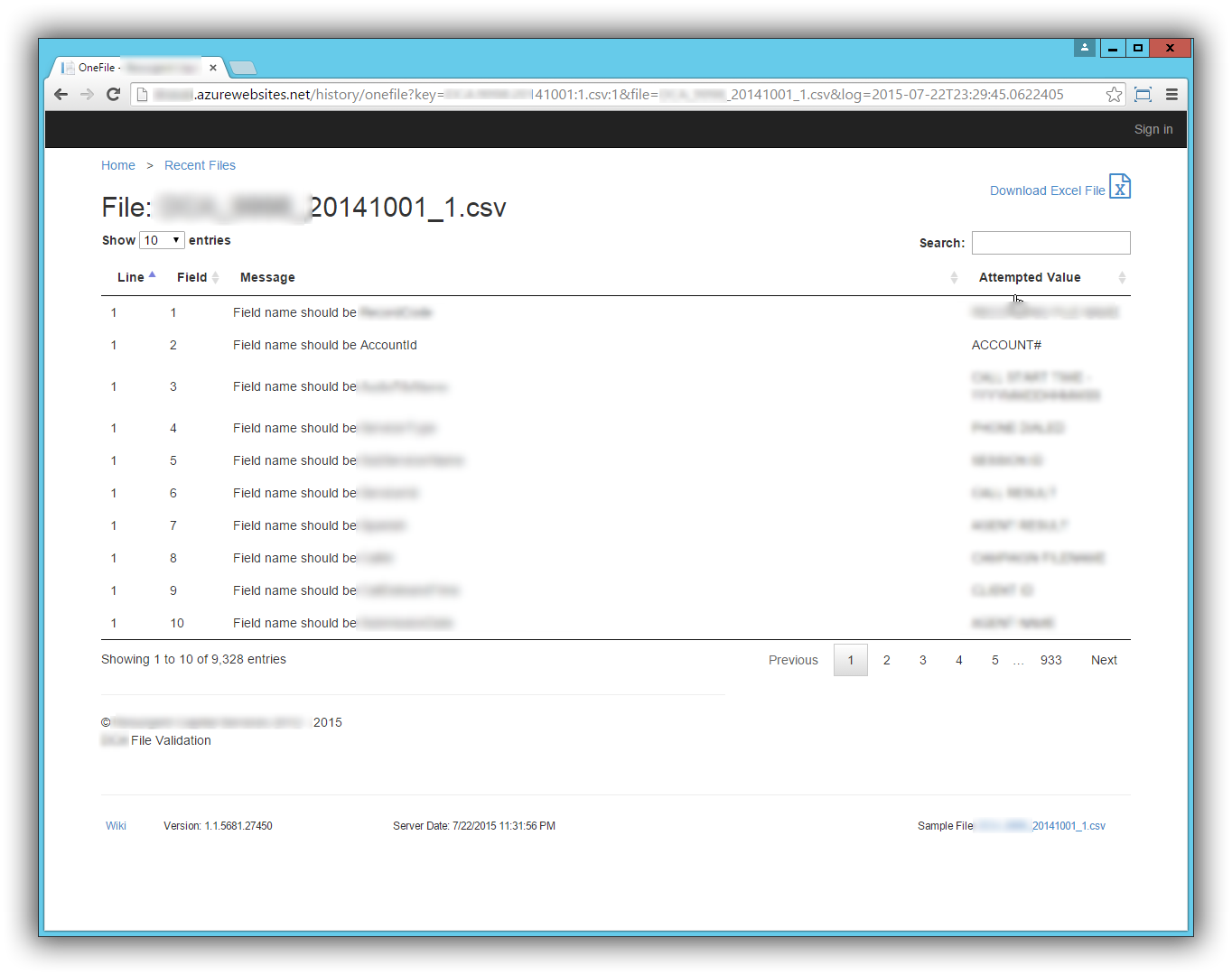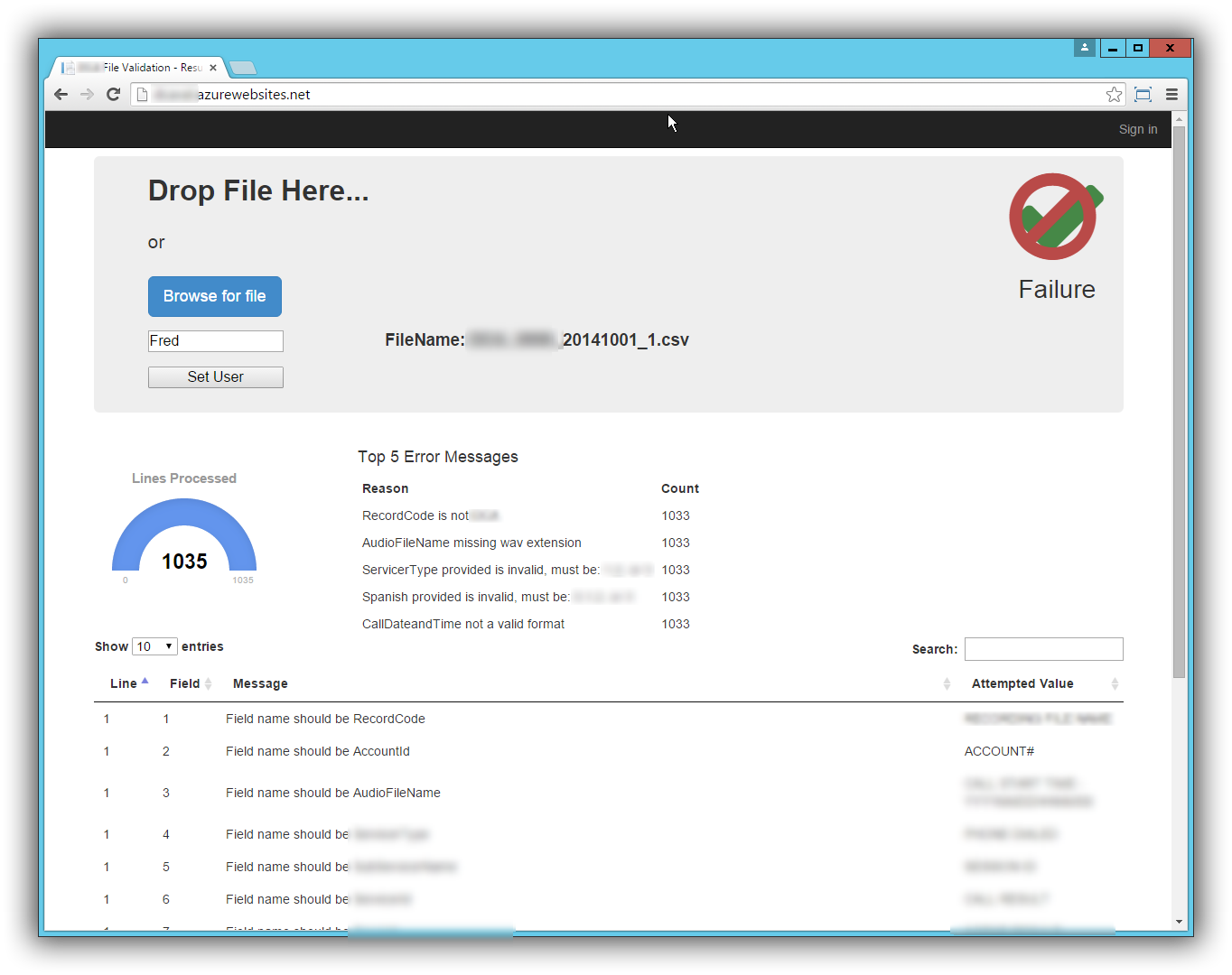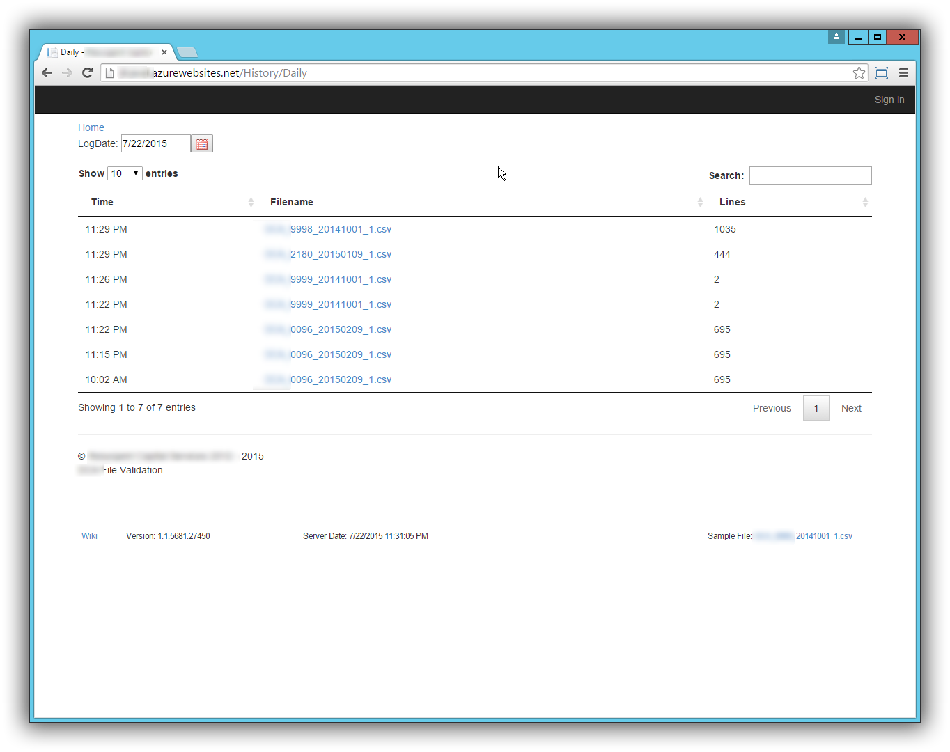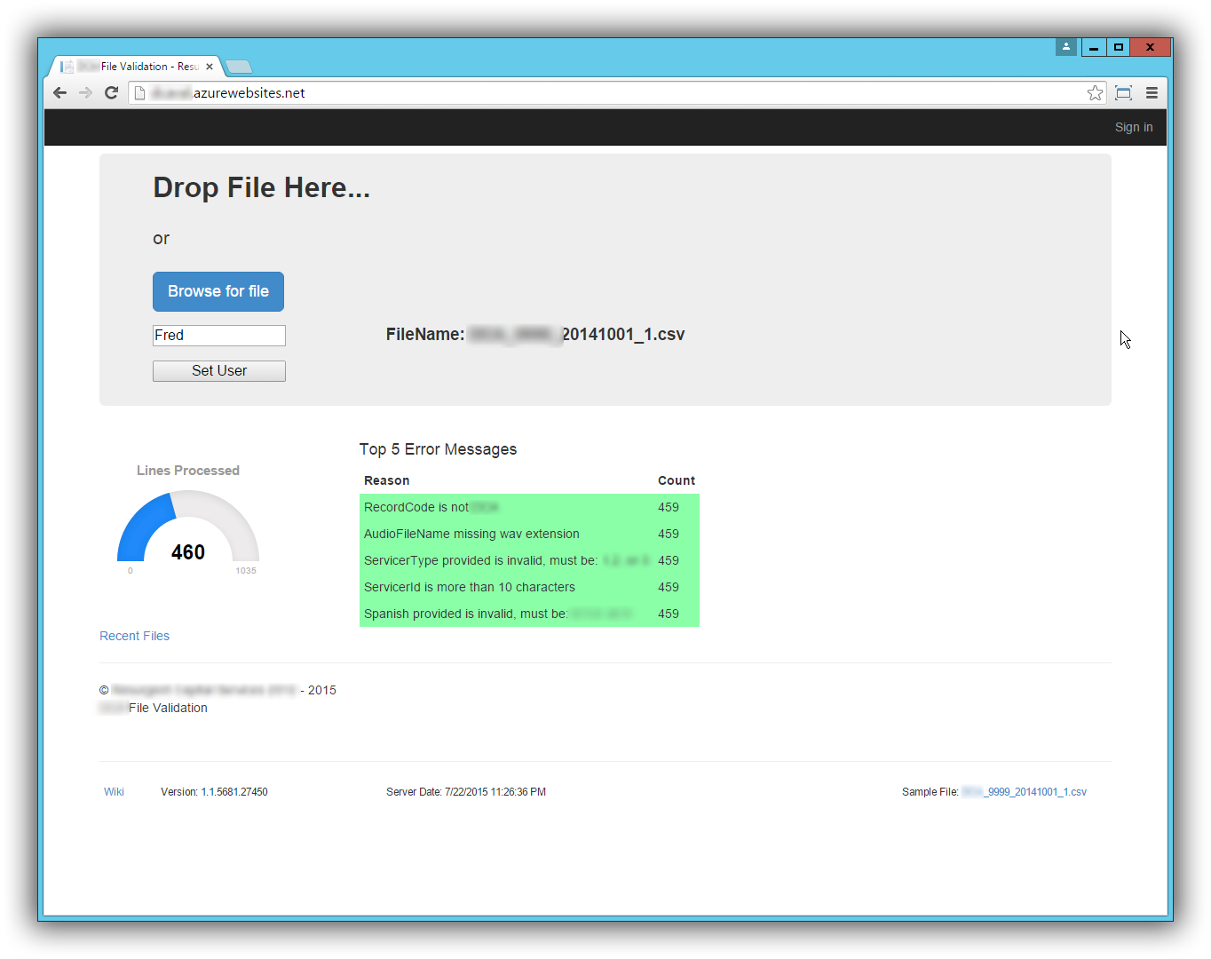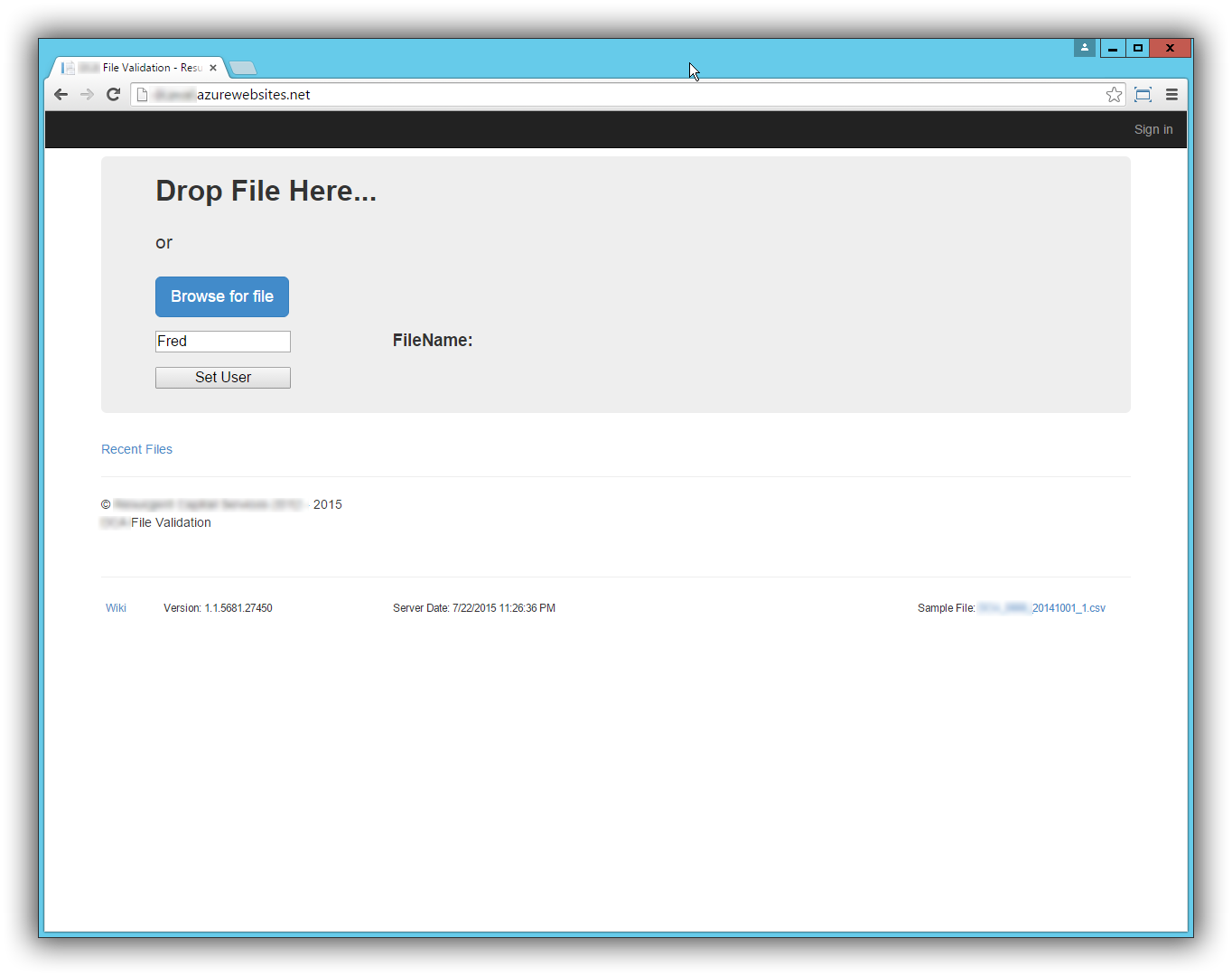 This project was to develop a site to validate files. The user will drop a .csv file on the page (or click the Browse button to find a file). After the file is uploaded, it will be analyzed to determine if it matches the expected format.This was an Azure project from the beginning, which made it fun. I was also able to use SignalR to provide immediate feedback to the user as the file was being analyzed. I use Redis on the server to store the results for the last 7 days. Purging old results is automatic, since Redis can expire a key after a set number of days.