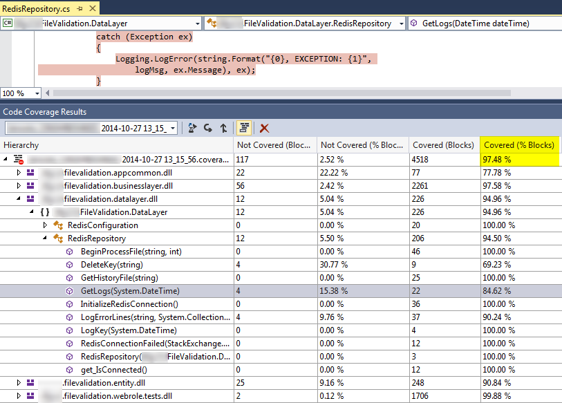 I know how rare it is to get 97% code coverage. I have been on projects where we were happy with 75-80% (and many where we had none). This was really helpful when we needed to do a version 1.1 of this project. I made the required changes, ran my tests. Some of them were broke, as they should have been, based on the new requirements. I fixed those tests and added a few more. I highlighted the catch block above, since that is the code that is hardest for me to get code coverage on. I know many people would eliminate the try/catch and let it bubble up. That would "fix" the code coverage issue, but I am not really sure that is a fix. In my experience, I like to catch the error as close to where it happened as possible. Often, I can add parameters that were passed to the method in the error handler so I know what value it was working with when the error occurred.Code Execution Time