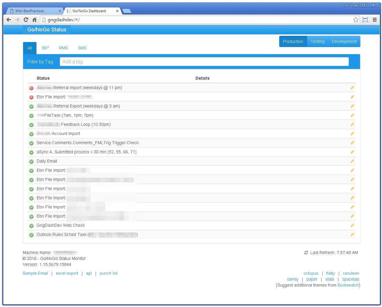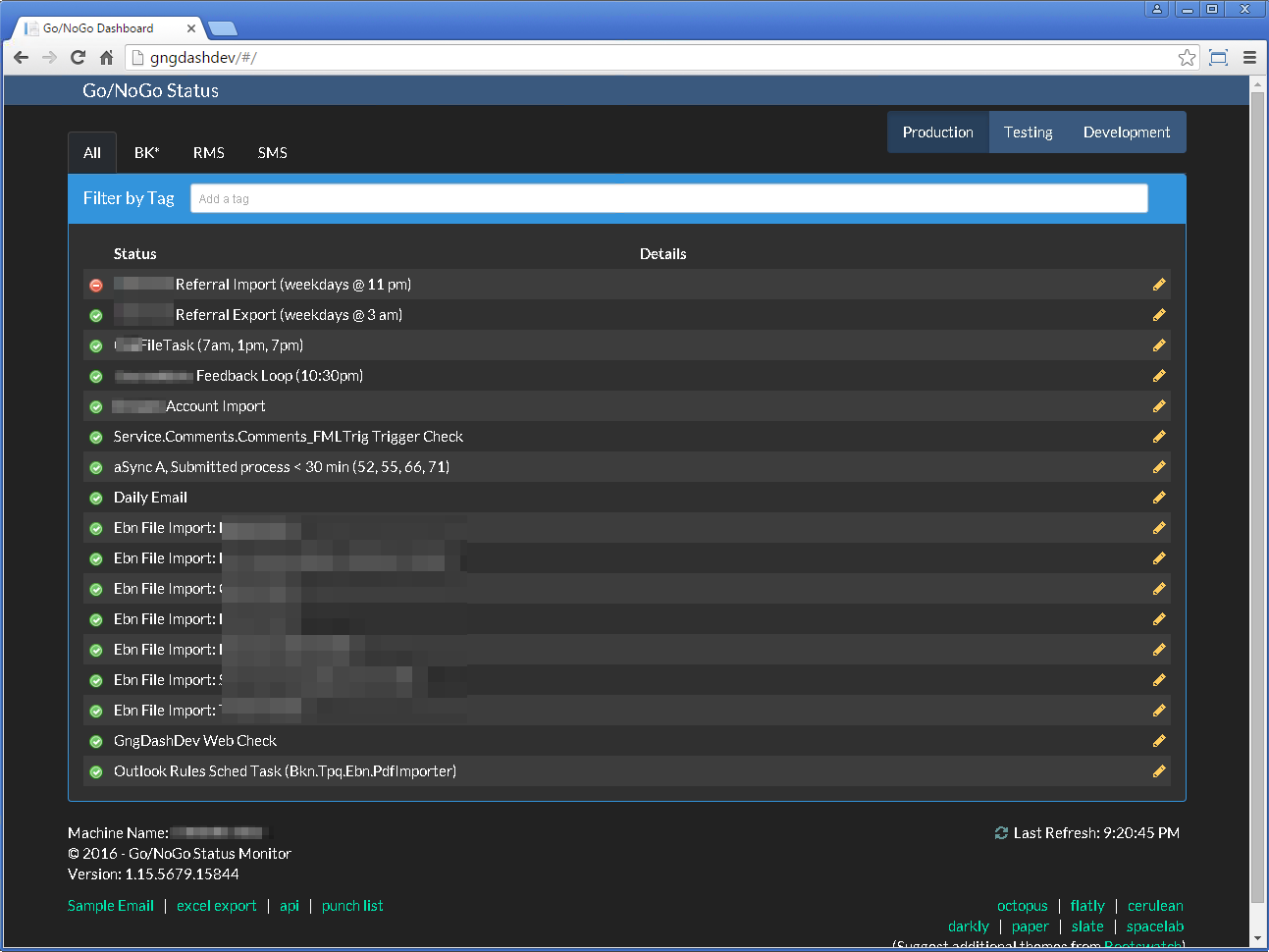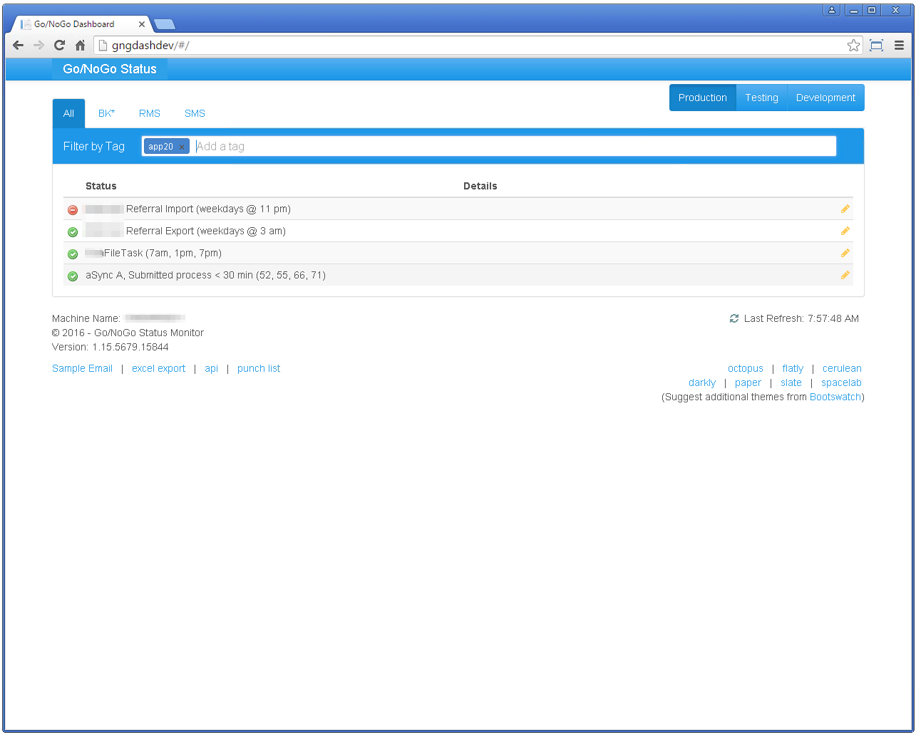 The system supports tags to make it easy to group related checks. For example, all tasks running on a specific server may be tagged with that server name.