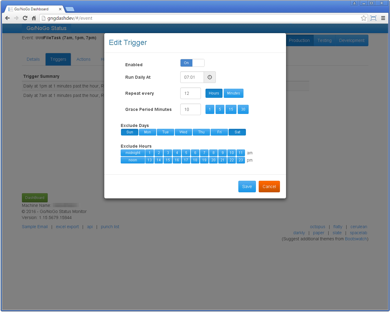 Clicking a trigger in the list brings up the modal edit dialog. I tried to use buttons to make it easy and visual for the user to "see" the schedule.