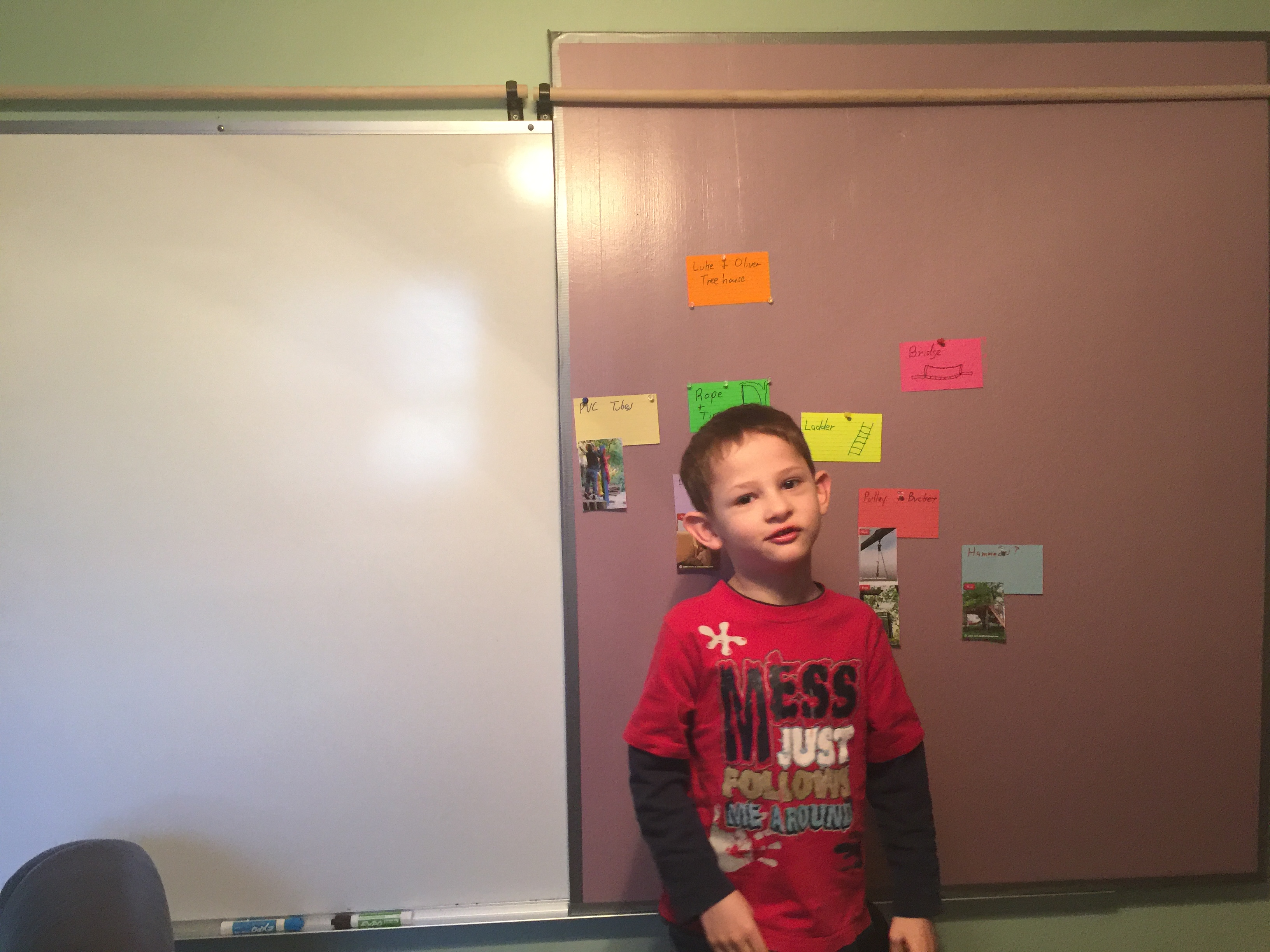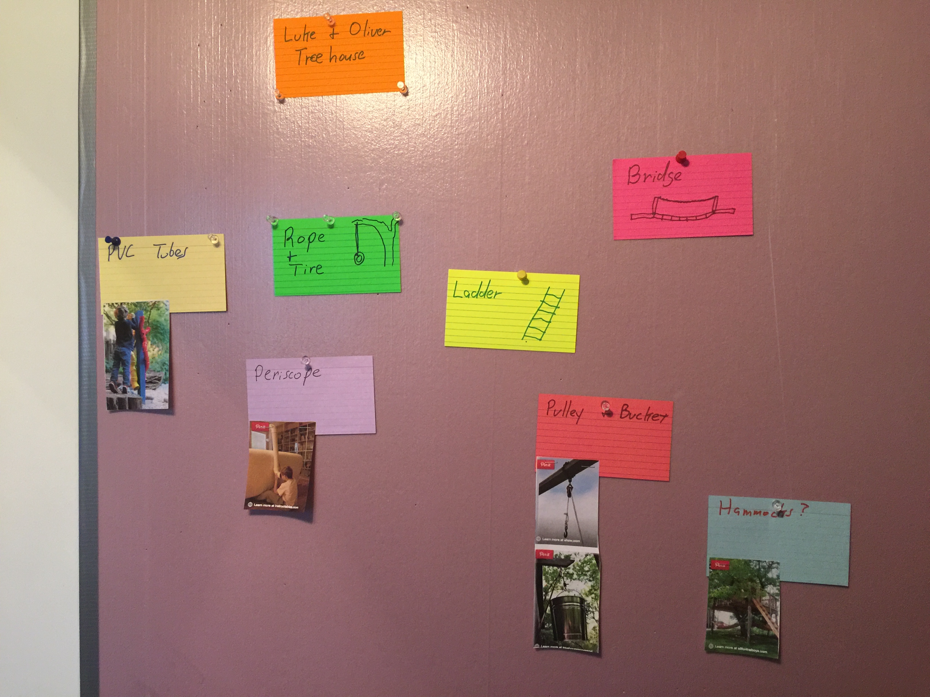 He came in this morning and asked why I had all the cards on the board. I figured it would be easier to show him than to explain it. I grabbed a clean board and we started "brainstorming" the treehouse he wants to build. He likes things a little more visual, so I printed some pics and attached them to the cards.