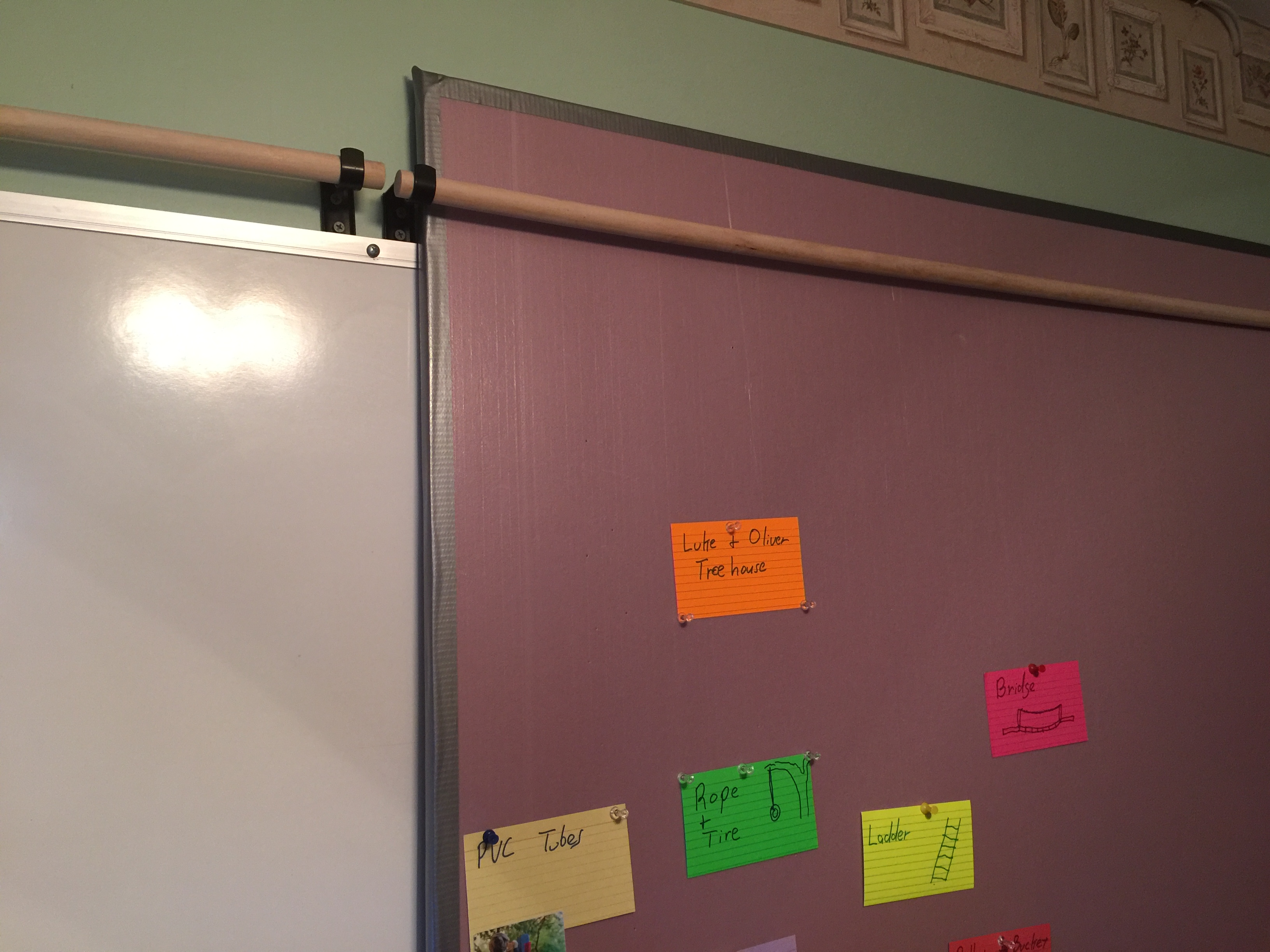 In my current setup, I added a few curtain rails along the top of my whiteboard. Then, I cut the insulation boards down to a smaller size and use them for "cork boards".