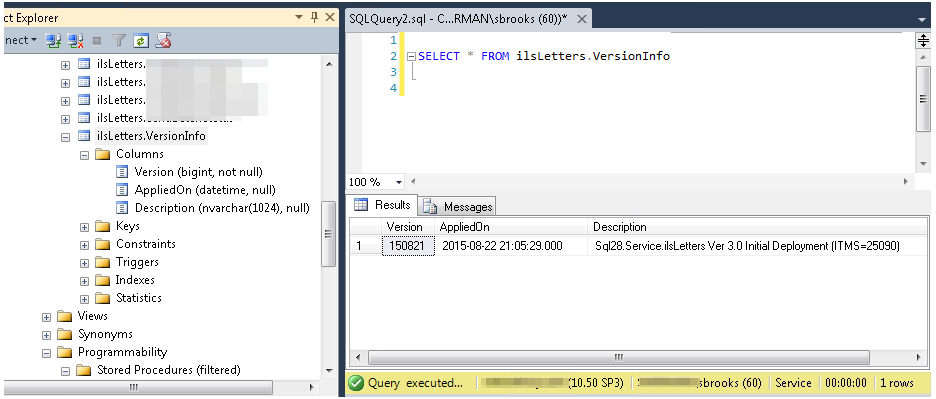 - Version History maintained in database (see screen capture below) showing exactly when each migration was applied (and Version, ITMS, PBI, or other info).